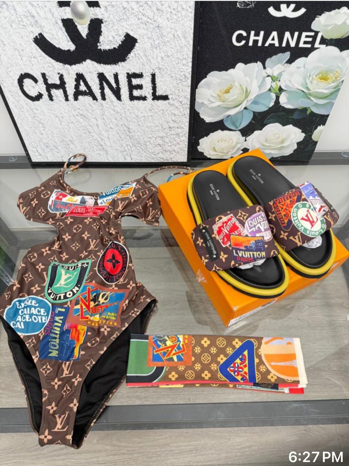Make every moment unforgettable with our Love Set — a chic 3-piece designer-inspired combo featuring a bold monogram swimsuit, matching slides, and a luxury scarf. Crafted for comfort and confidence, this set blends street-style energy with timeless elegance — perfect for beach days, vacations, and luxury lounging.